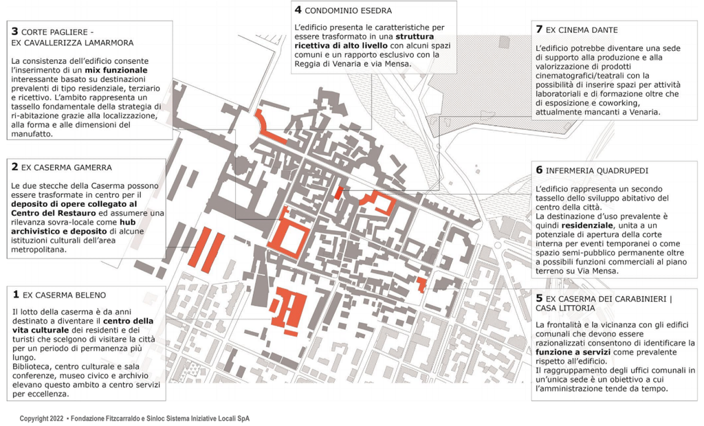 Il contributo ha permesso di realizzare uno studio per la rigenerazione urbana di alcuni edifici. Il 31 gennaio 2022 tale studio di fattibilità tecnica ed economica realizzato dalla Città di Venaria Reale con il supporto di Fondazione Fitzcarraldo e di Sinloc – Sistema Iniziative Locali S.p.a. è stato presentato con una conferenza stampa.