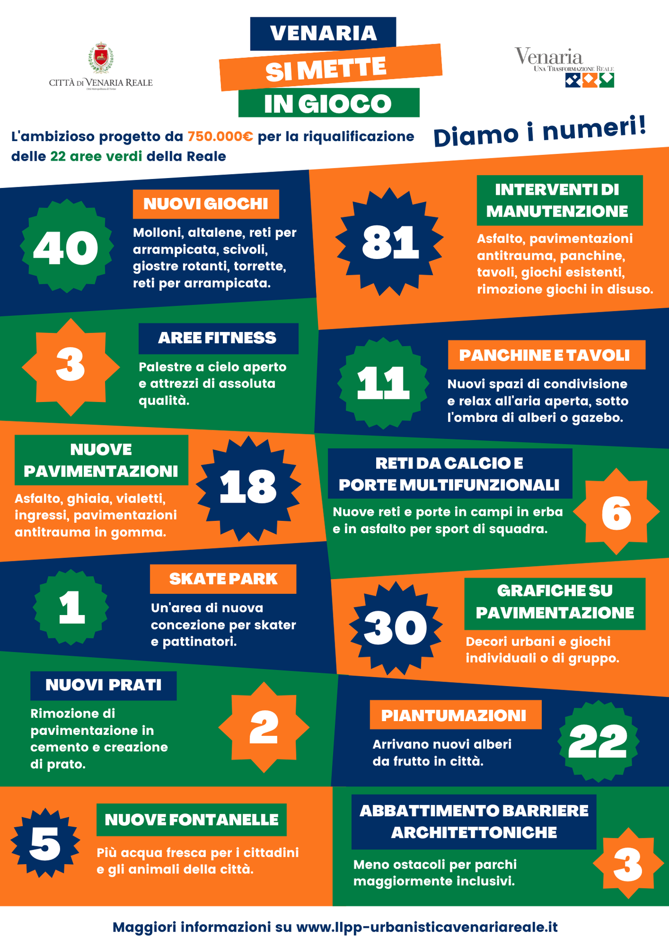 L’amministrazione comunale ha avviato nell’estate 2022 i lavori per la realizzazione di interventi diriqualificazione in 25 aree verdi site nel territorio della Città di Venaria Reale, per un investimento complessivo di Euro 750.000.